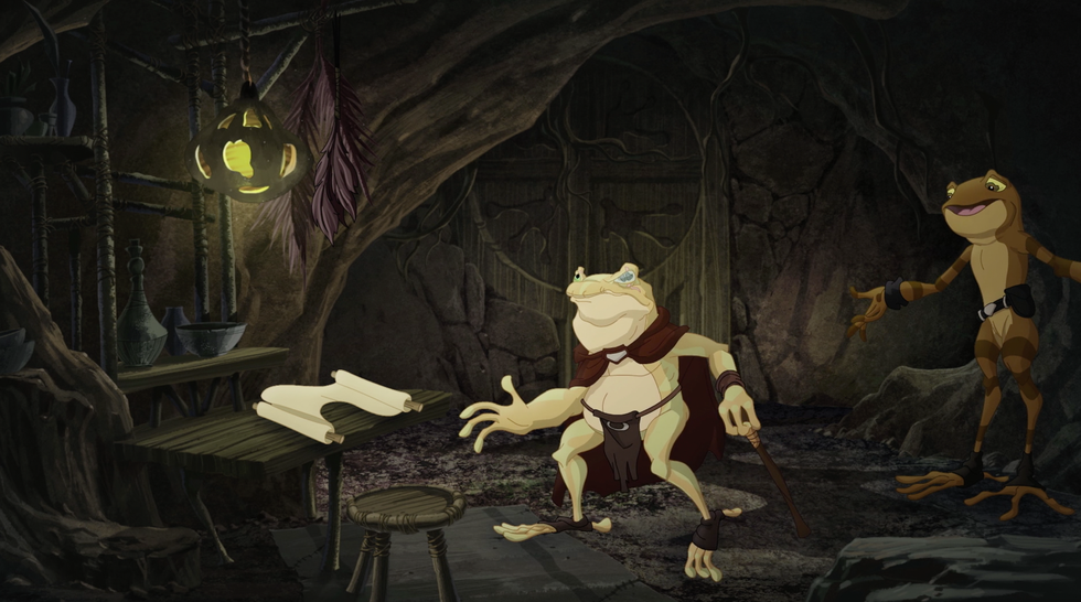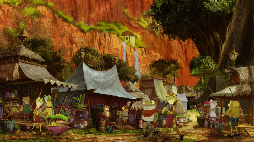 And as stated before, Mark Hamill plays Jir, the typical crotchety retired old warrior that everyone assumes is crazy but still acts like a mentor to the main hero. There are other characters, of course, but these five stick out the most as characters the audience has definitely seen before. The only thing that makes them different here is that they are frogs. The designs of the frogs bugged me at times as well; for some reason, the designers thought it was necessary to give the female frogs a pronounced chest and therefore they have to be more covered up with clothes. Meanwhile the male frogs can get away with only wearing a belt and cape at most.
