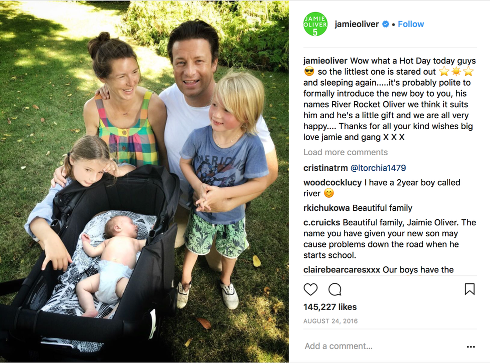 Chef Jamie Oliver and his wife Jools welcome River Rocket into this world in 2016!