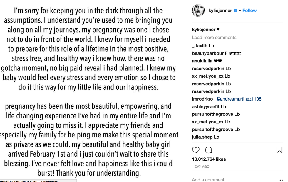 On February 5th, the world was shook. After months and months of denial and complete media avoidance, Kylie Jenner emerged. She revealed that for the past 9 months she has been carrying Travis Scott's child, and gave birth to a baby girl on February 1st, 2018. She came out to the world in an Instagram post and apologized for keeping her fans in the dark about her pregnancy, then going on to explain that she wanted to prepare for this journey out of the media's eye and without judgment. In her Instagram announcement, she even included a link to a Youtube video following her 9-month journey.
