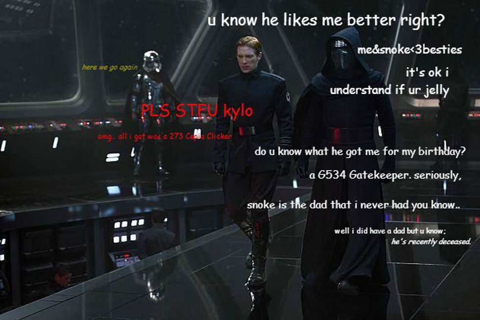 Not to mention that besides stanning his own grandpa, Kylo Ren has a really weird competitive relationship with General Hux to impress Supreme Leader Snoke. General Hux sorta cares, but the dude is ultimately just trying to do his job. But Kylo, our favorite loser, is desperate to one up anybody who challenges him.
