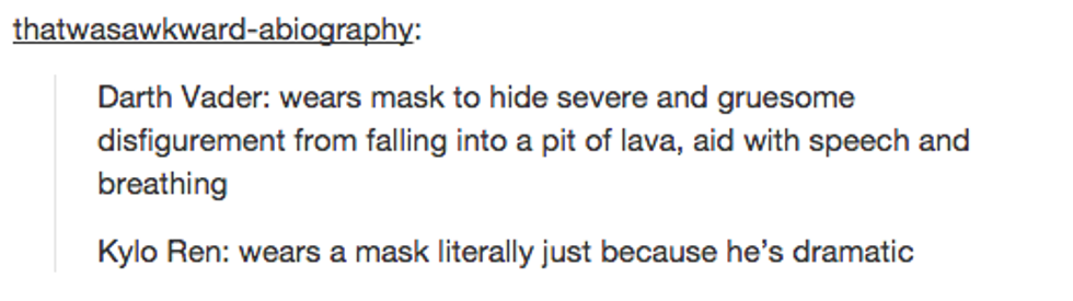 (Though my interpretation of Kylo was meant to be more humorous than anything, I seriously recommend checking out this article if you want to understand Kylo Ren/Ben Solo a little better. Kylo Ren has the opportunity to become one of the most memorable characters in cinema considering the circumstances, and I have a feeling Adam Driver will be able to deliver even more than he has already.)