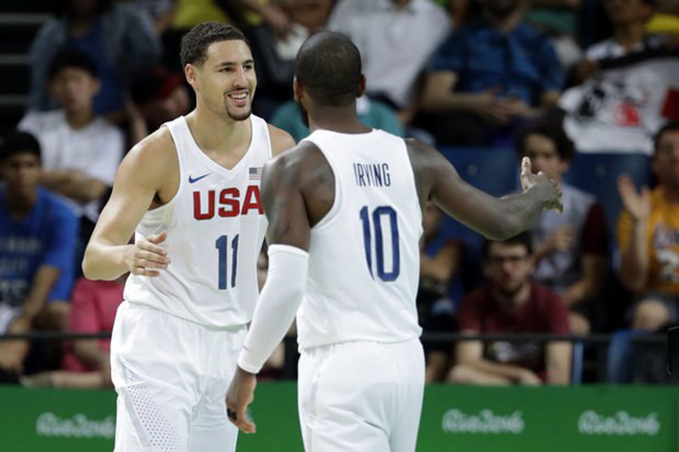 (Charlie Neibergall) Kyrie Irving celebrating with his Team USA teammate Klay Thompson.