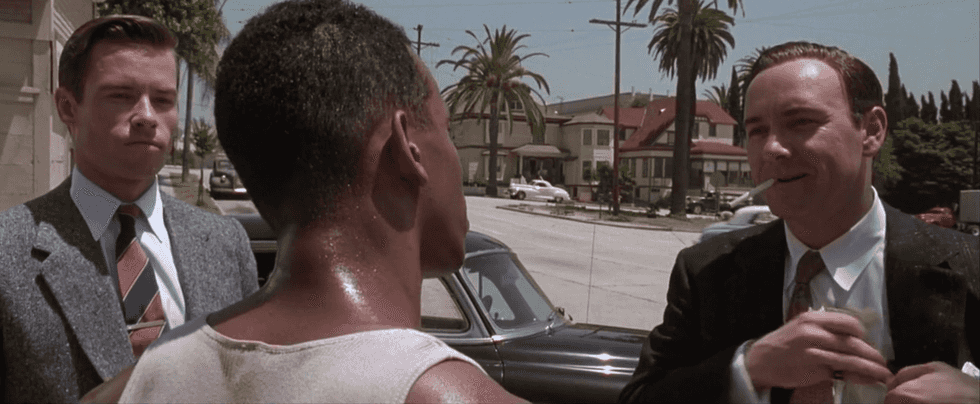 Spacey's character is one of the film’s three protagonists. There is Officer Bud White (Russell Crowe), whose gung-ho interpretation of the law and almost superhuman strength make him “the muscle” of the force. And then there’s Detective Ed Exley (Guy Pearce) on the other end of the spectrum. Though dubbed “Shotgun Ed” midway through the film, Exley sticks to the books, reporting and filing his way towards the top of the law-enforcement hierarchy.