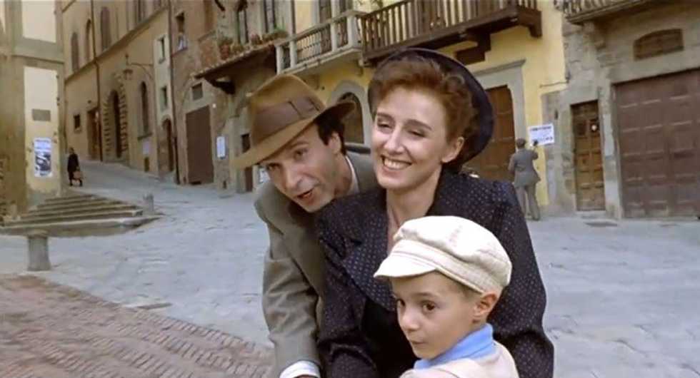 The first half of the film, set in 1939, follows the amusing, humorous buffoonery of Guido who has just arrived at the town of Arezzo, Italy to work as a waiter in his uncle’s luxurious hotel. After several clumsy encounters with a pretty schoolteacher named Dora (Nicoletta Braschi), he sets his romantic sights on her. Guido eventually charms her and wins over her affections, helping her escape from her stiff, upper-class fiancé by whisking her away on a horse in one of the film’s most memorable scenes. Filmed with an abundance of light and soft color, the first part of the movie lends an aura of fantasy and humor to the story.