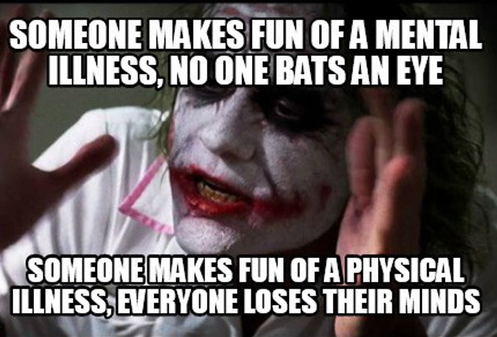 Being labeled as "mentally ill" has a certain stigma that comes along with it. Mental illness is relatively taboo. It is not well known that approximately one out of five adults will experience mental illness in a given year. For more statistics, go here. Anyway, when one is labeled as mentally ill, he or she is perceived as weak, disgraceful, shameful. He or she probably feels embarrassed by his or her illness. Mental illness is normally thought of as a choice or at least depression is. As far as being sick goes, being mentally ill is just plain not acceptable and people will not support it.