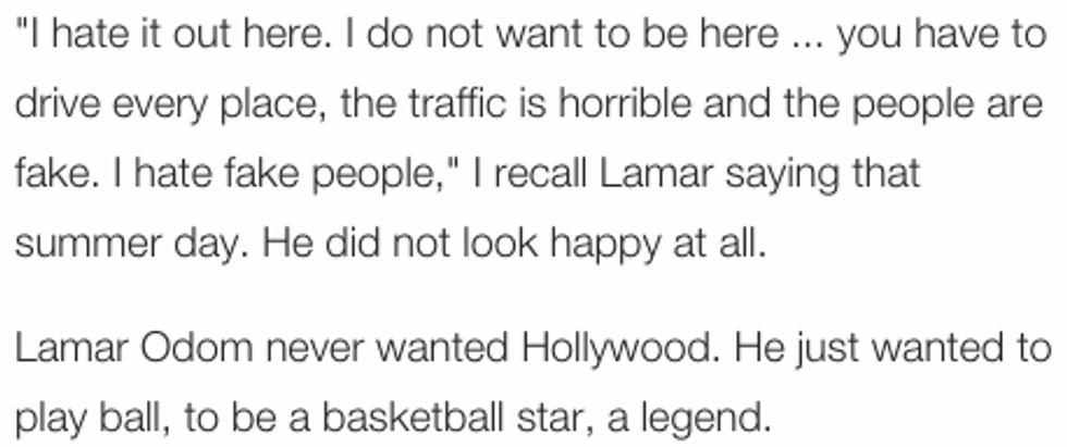Odom wanted what he set out for when he was young, not what was thrown on his path along the way. He set out for stardom on the basketball court and set out for a better life than the one he had. His father was a heroin addict and his mother died from colon cancer when he was 12. Contrary to what we all thought, his life was never easy for him. Even in college, he struggled with grades, the law, and NCAA rules, leaving him ineligible to play for many seasons. At the University of Rhode Island, he was named the most valuable player after he led the team to their first Atlantic 10 title. After playing his freshman year there, he signed for the draft and was signed by the Los Angeles Clippers. Most of his NBA career was spent with the Los Angeles Lakers (2004-2011), a place we now know he did not necessarily want to be.