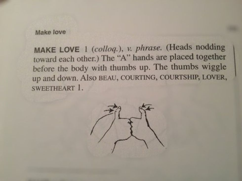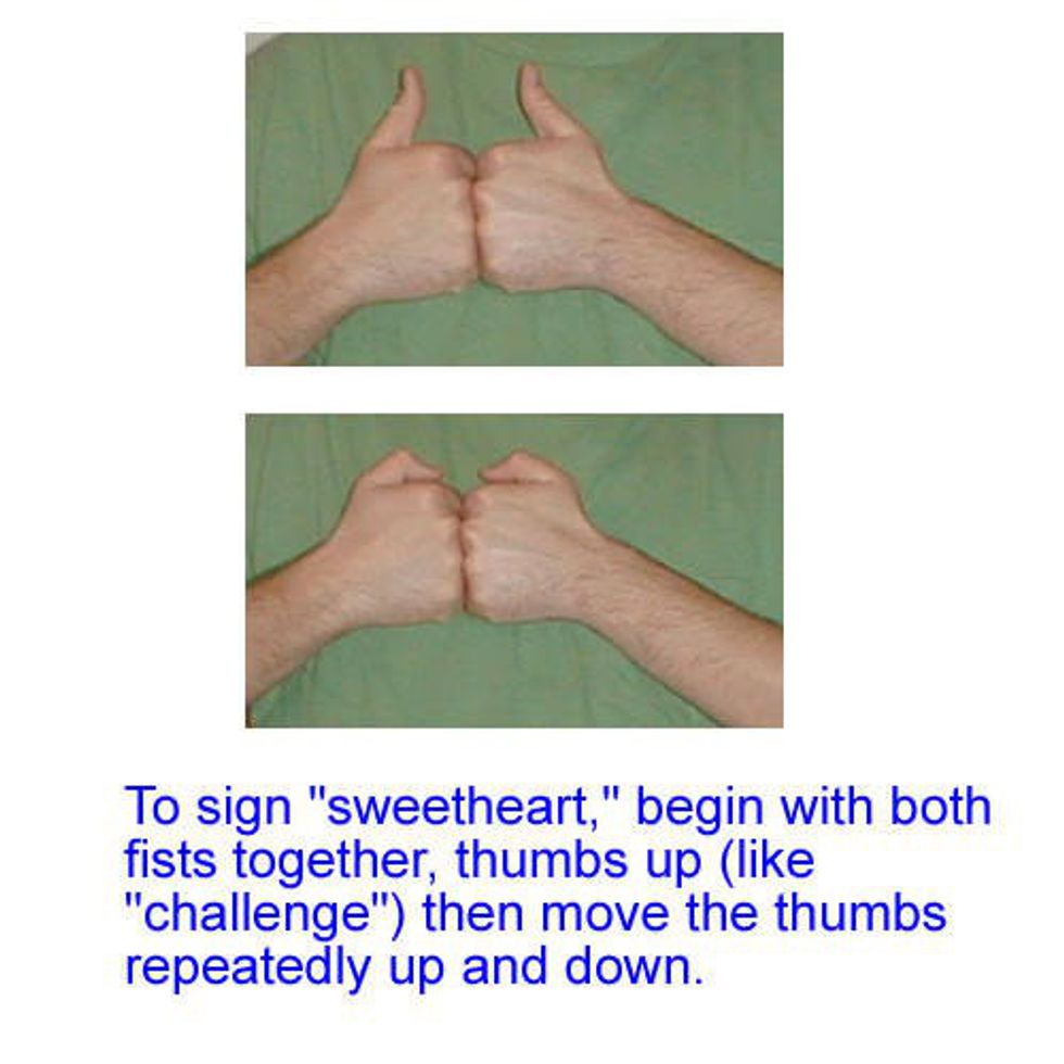In sign language, two thumbs up together means "sweetheart" or to "make love"