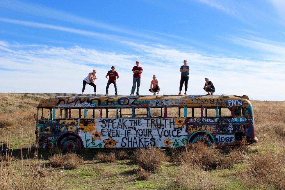 We drove a few more minutes to an abandoned bus we'd heard about before. It's just off the highway in an empty field, surrounded by broken glass, old clothes, mattress springs, spray paint cans, and all manner of weird, gross, probably diseased things. But the bus itself was amazing. It was covered in decades' worth of spray paint, words, phrases, and pictures ranging from the extremely profane to the incredibly profound. And to my weird word-loving soul, it was beautiful.