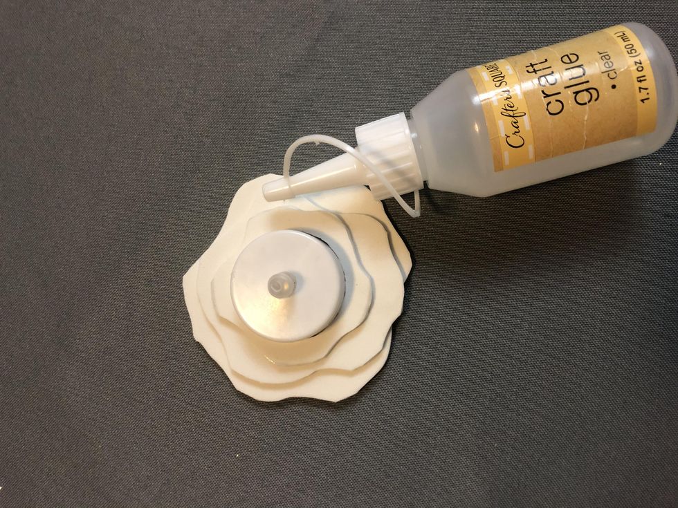 This step is possibly the most complicated, but I've included pictures to hopefully help you out! All you need to do is cut three circles out of your white foam, card stock, or paper. They should all be bigger than the circumference of the tea light, but they should also be concentric, meaning they should get smaller as they go. Then, go around the edges of your circles and give them some curvy edges and dips. This will make it look like a puddle of melted snow. Finally, trace the circumference of your tea light on all of the pieces and cut out the center so the pieces will fit around the tea light. Be careful not to cut too much out of the center, or else the pieces will slip right off the tea light.