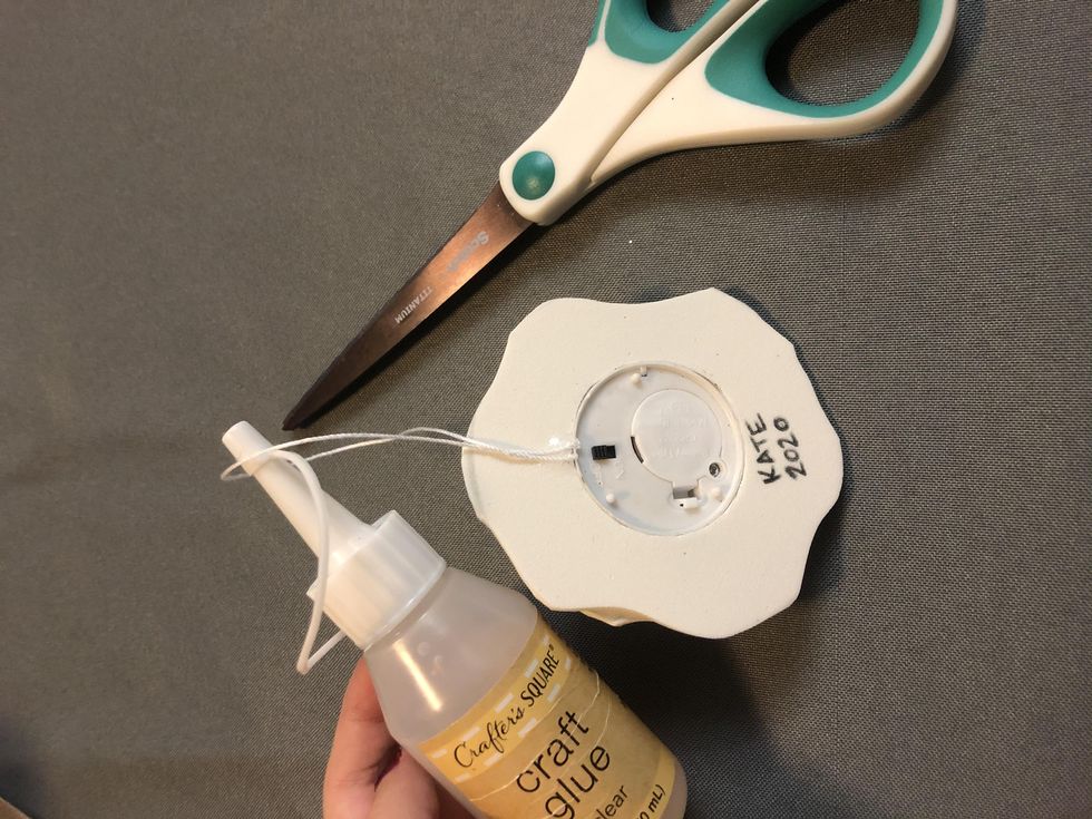 This step seems easy, but there are a few important things to keep in mind. First, cut an appropriately sized length of string, twine, or yarn (mine is about 9 inches long). Since this ornament will light up, you'll need to make sure you don't glue the battery compartment shut. This way the new owners of your ornament will be able to change the batteries when necessary. Also, make sure to double check the placement of your string/twine/yarn so that you don't end up hanging your snowman ornament upside down! I've included a picture of a good way I found to glue my string to avoid gluing the battery compartment shut, but will still keep the snowman hanging upright.