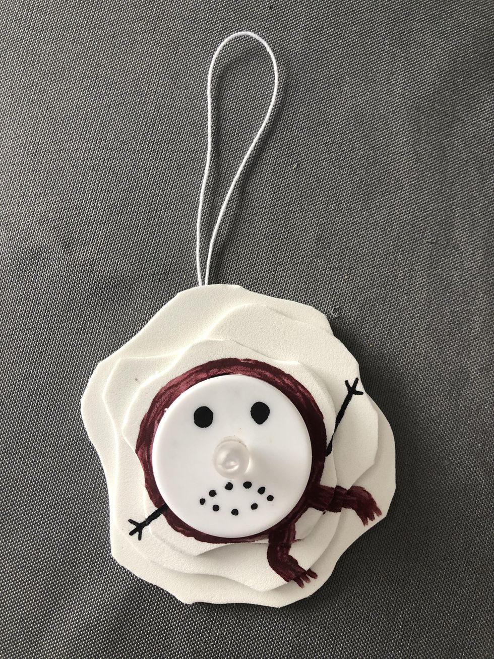 This is my favorite step! Use the black Sharpie or pen to draw eyes on the top of the tea light above the flame. You can give your snowman a smile, or a frown made out of coal. You could also draw stick arms or even draw on a scarf on the sheets of foam/card stock/paper if you wanted to! This is when your melted snowman will really come to life. I also think it's a good idea to write your name and the year on the back of the ornament. This personal touch will help whoever you give the ornament to remember who made it and when they got it.