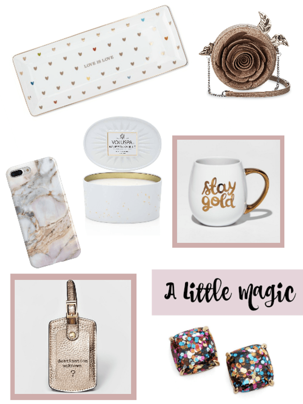 "Love is Love" Tray($19.95), Beauty and the Beast Enchanted Rose Crossbody Bag($59.95), Kate Spade Earrings ($32), "destination unknown ?" Luggage Tag ($6.99), "Stay Gold" mug, Marble Phone Case ($20.00), Voluspa French Bourbon Vanille Candle ($18.00)