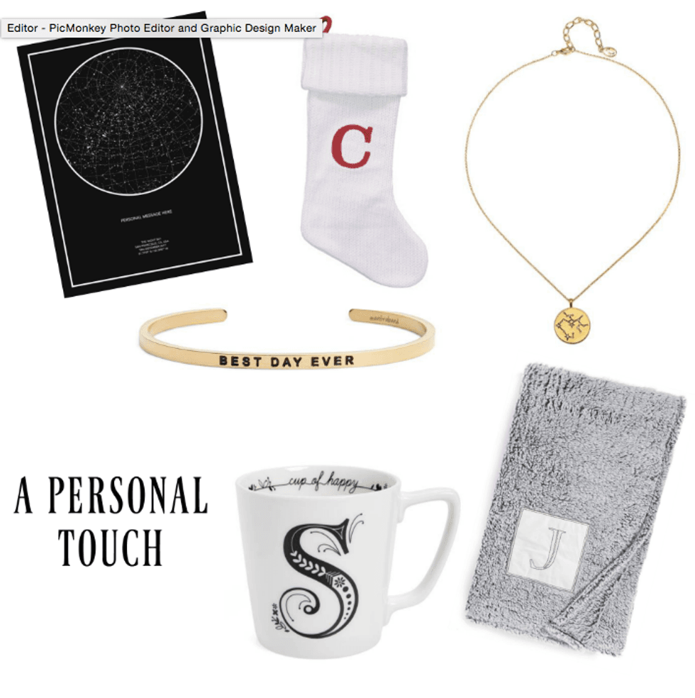 Monogrammed Stocking ($9.10),Celestial (Astrology) Necklace ($58.00), "Cup of Happy" Monogram Mug ($14.99), Monogrammed Throw ($29.90 on sale!), Mantra Band "Best Day Ever" ($35.00)