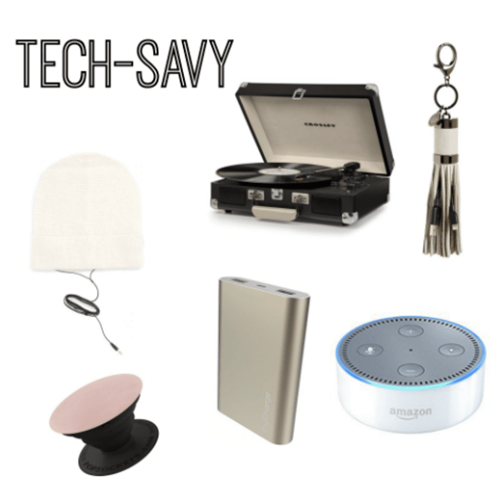 myCharge Portable Charger ($29.99), PopSocket ($15.00), Crosley Chalkboard Record Player ($69.95), Tassel Charging Cord ($50.00), Amazon Echo Dot 2nd Gen. ($29.99 40% off!), Slouchy Beanie w/ Headphones ($38.00)