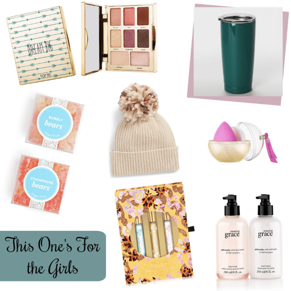 philosophy. grace for the holidays set ($18.00), BP. Colorful Pompom Beanie ($15.00), Midas Touch Duo beautyblender ($25.00), sugarfina candy ($40.00), Dream Big Tarte Eye Shadow Palette ($30.00), Daisy Rollerball Trio ($45.00), Maverick 18oz Stainless-Steel Tumbler ($10.00),