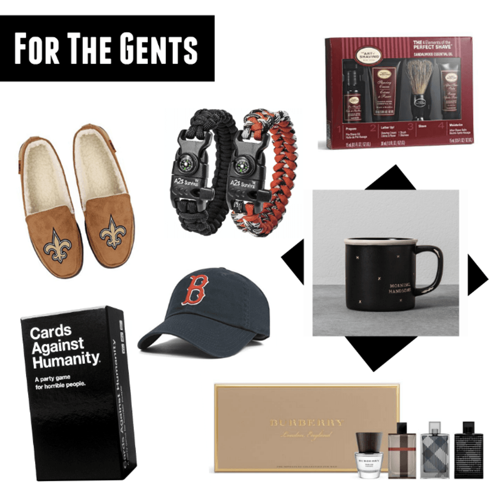 NFL Slippers ($29-39), MLB Ball Cap ($19-29), Survival Bracelet ($10.99), The Art of Shaving Shave Kit ($20.00 25% off!), "Morning Handsome" Mug ($5.99), Burberry Cologne Set ($45.00), Cards Against Humanity ($25.49)