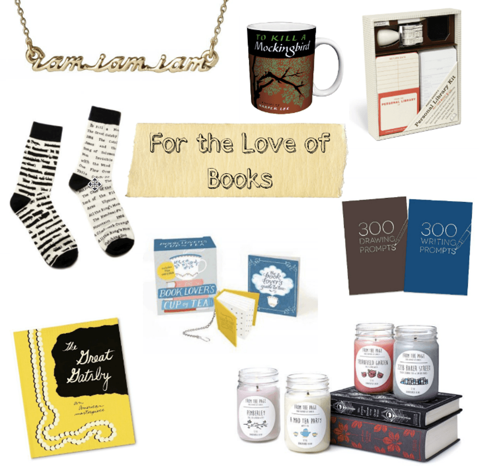 "I am I Am I Am" Necklace ($30.00), To Kill A Mockingbird Mug ($12.95), Banned Book Socks ($9.95), Knock Knock Personal Library Set ($16.00), Book Lover's Cup of Tea Diffuser ($9.95), Piccadilly 300 Prompts Journal ($6.99), Literary Candles ($16.00)