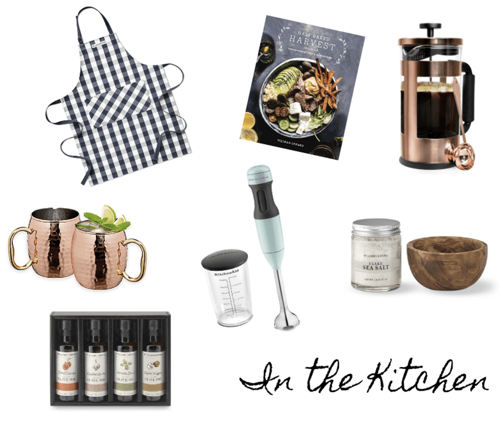 Copper Coffee French Press ($19.99), Half Baked Harvest Cookbook ($19.92) KitchenAid 2-Speed Hand Blender ($31.99), Williams and Sonoma Salt Cellar ($19.95), Williams and Sonoma Olive Oil Gift Set ($39.95), Checkered Adult Apron ($29.95), Hammered Copper Moscow Mule Mugs ($19.99)