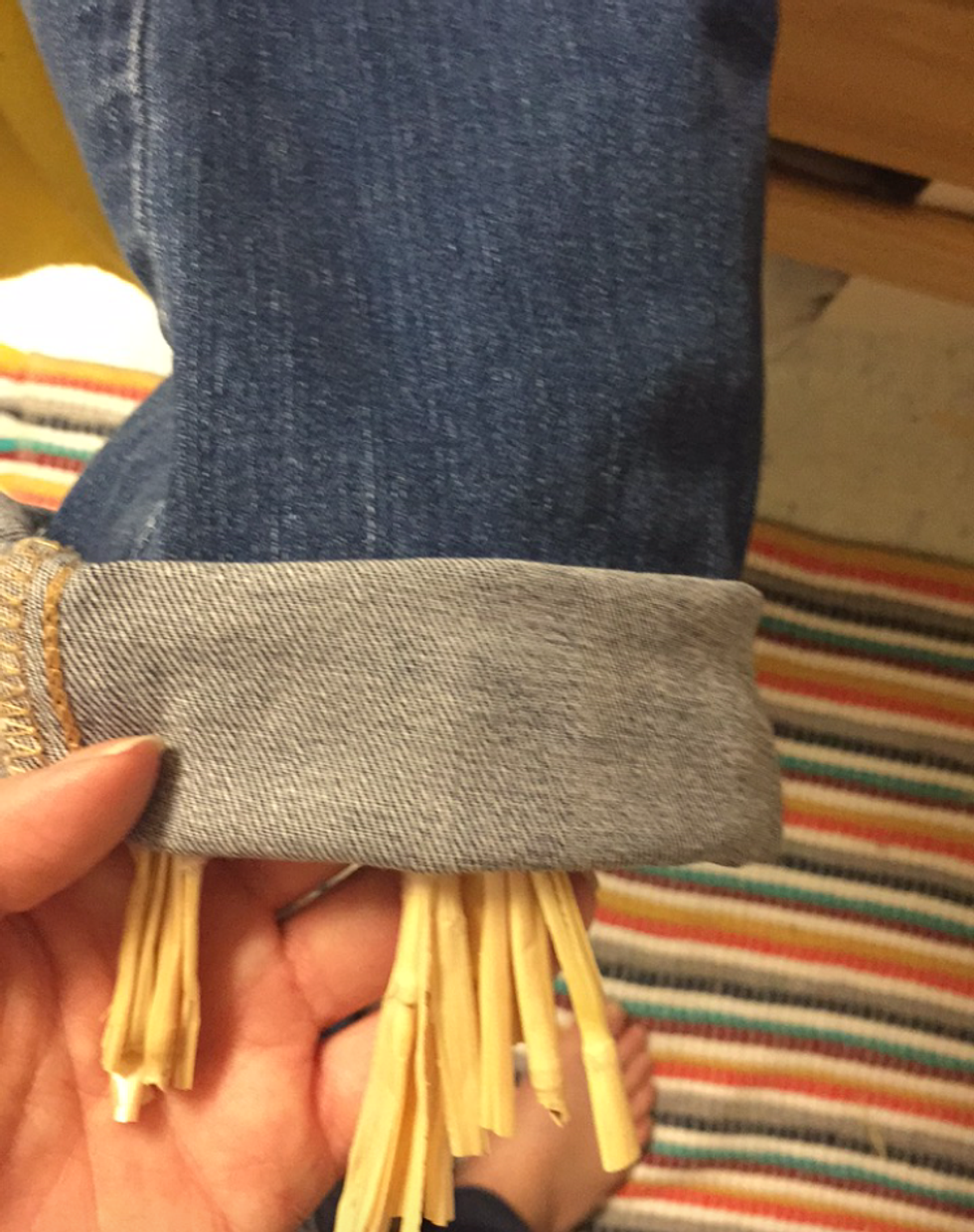 4. Cut more short pieces of straw and tape to the bottom of your pants.