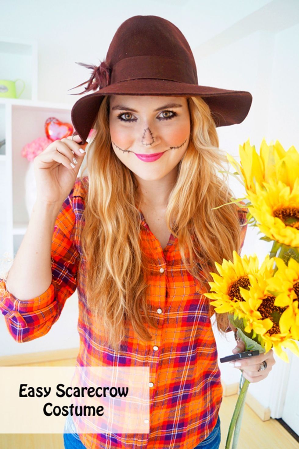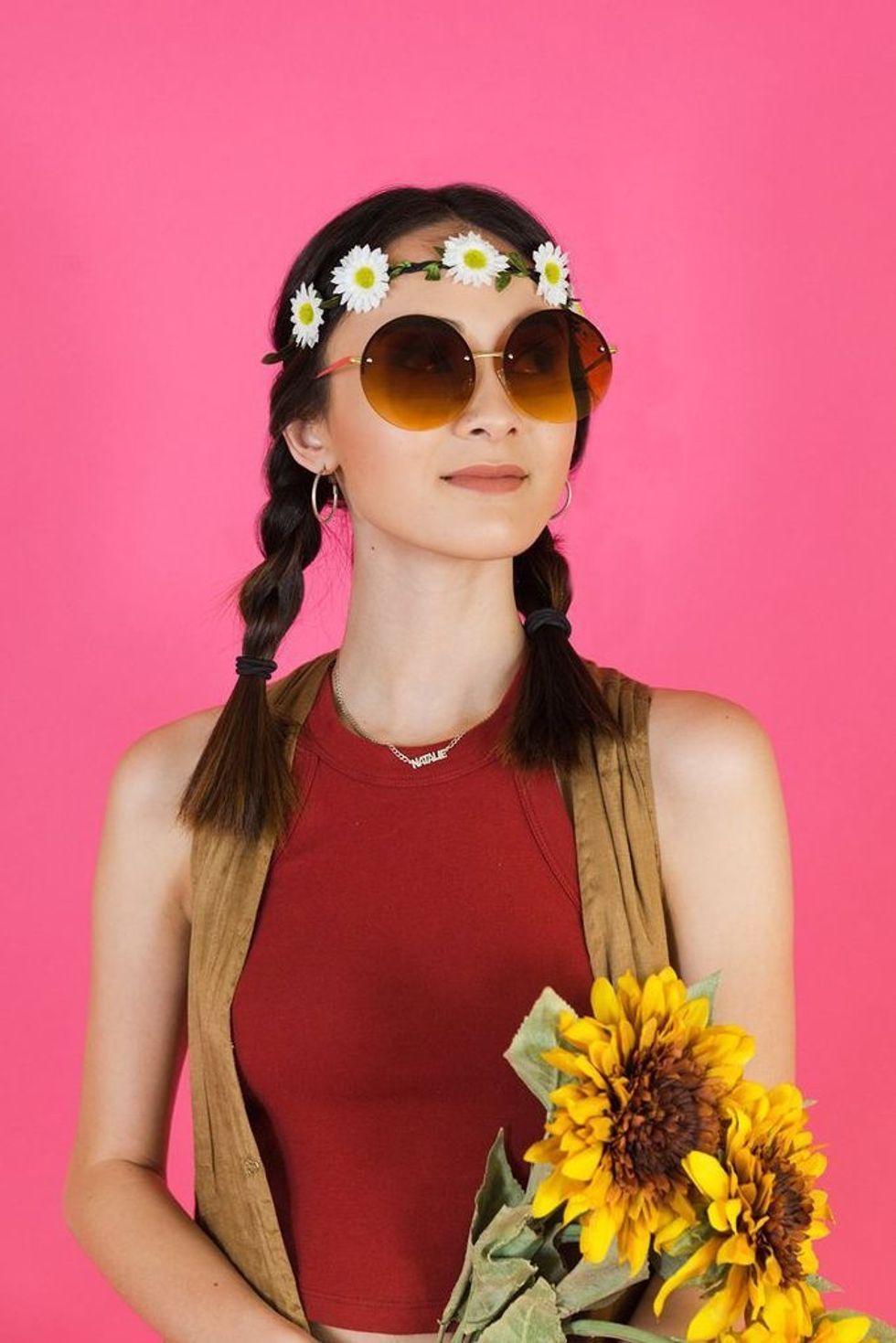 All you need is a pair of round sunglasses, a flower crown, a vest and tank top, and some sunflowers from your local grocery store, or fake ones from the Dollar Store.