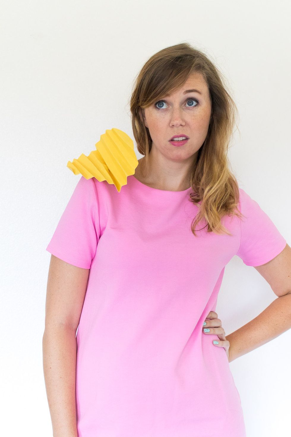 The best part about this costume is that you can wear anything and it's a simple DIY using yellow construction paper that you crinkle into your favorite chip shape, and then secure it to whatever you wear.