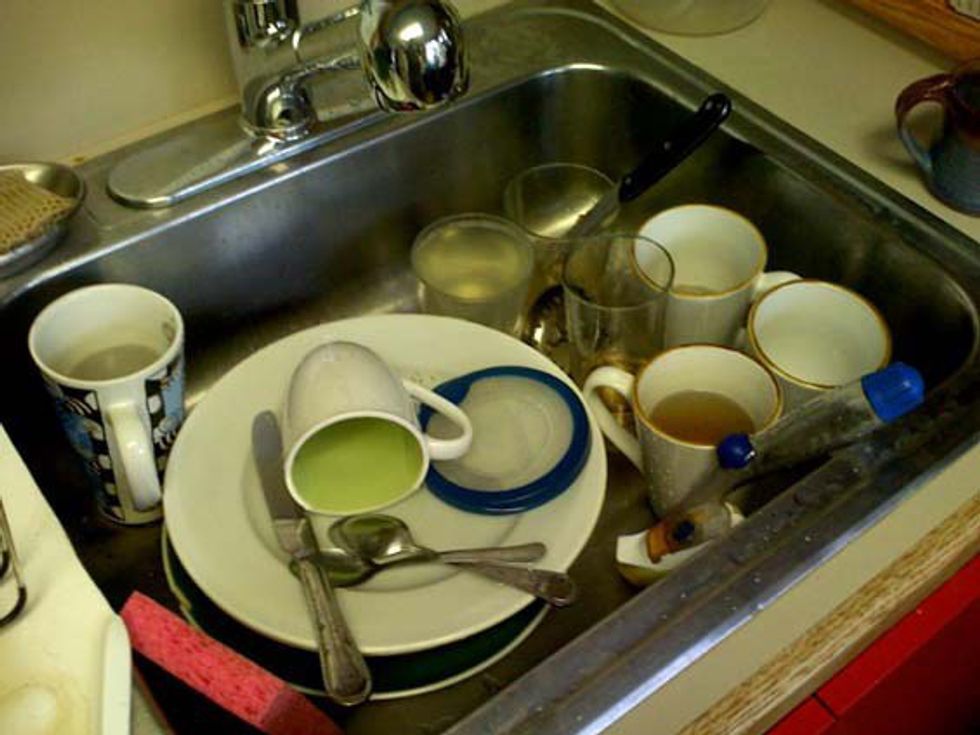 "You're gonna waste water for five plates, four cups, seven forks, three knives, two bowls and that pot?"