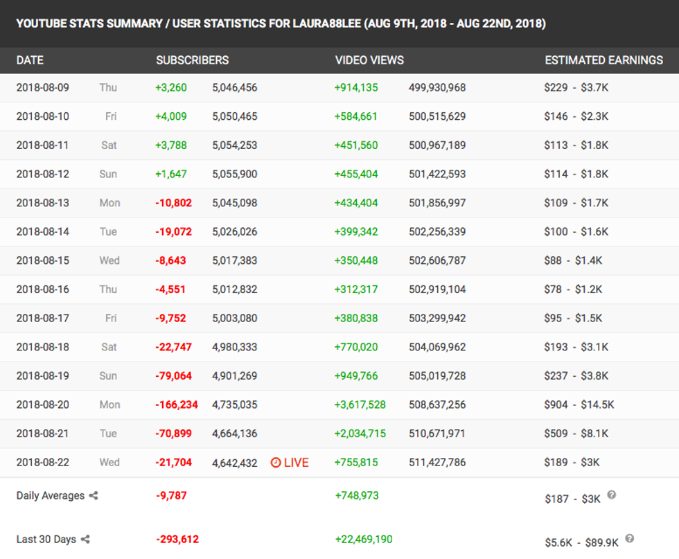 A week later she made a four-minute long YouTube video apologizing and saying how she changed and lives in a more diverse world now. Jenna Marbles uploaded a 47-minute apology video for getting the wrong fish tank but Laura uploaded a four-minute video of her fake crying for racist tweets. I think the one big thing that Laura said is that she blames Alabama for her being uneducated which made people angrier and more frustrated at her and started unsubscribing. So here's her subscriber count as of Wednesday, Aug 22: