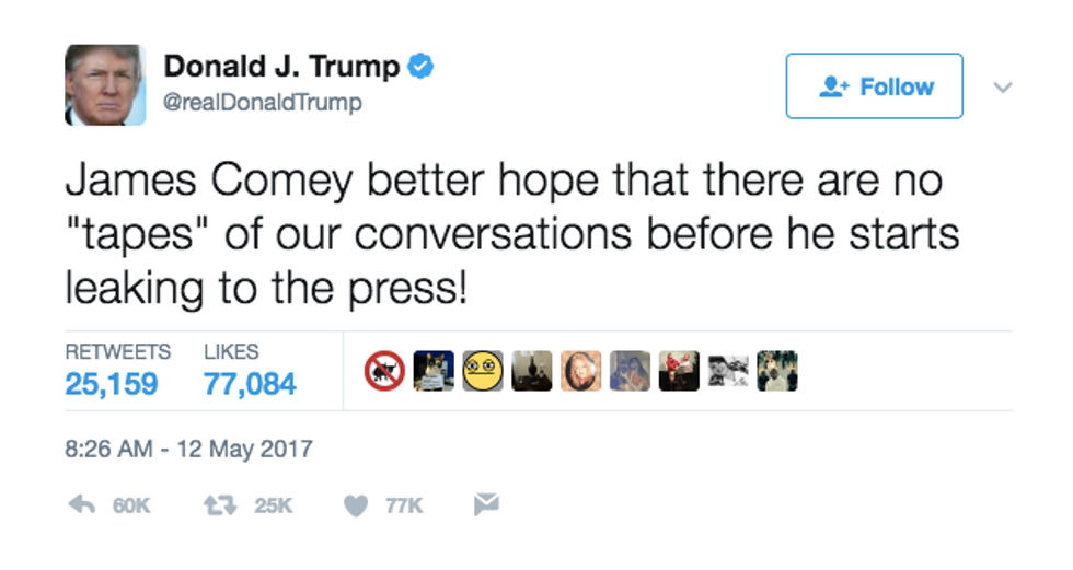 The tweet reads, "James Comey better hope that there are no "tapes" of our conversations before he starts leaking to the press!"