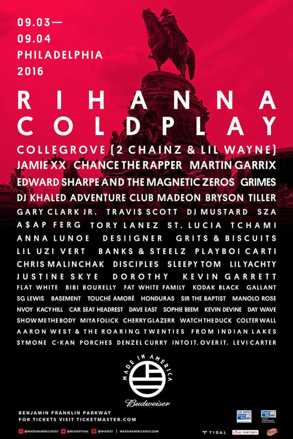 Sometimes I’m really glad I go to college only about an hour and a half away from Philadelphia, and even more so now that Made in America, a music festival hosted by Jay-Z, in its fifth year running, is happening next month. Two pop music icons, Coldplay and Rihanna, are headlining this year with a slew of other amazing performers, like Chance the Rapper and FKA Twigs and many, many more. The official Budweiser poster is featured here: