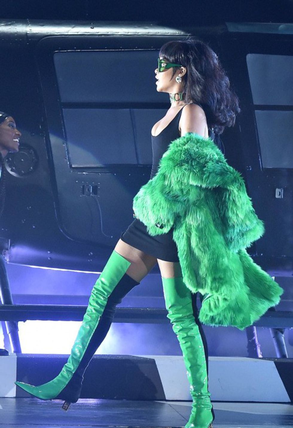 ICONIC. If I could just say that and move on, I definitely would. With the green fur coat, go-go boots, and giant helicopter, anyone would feel as bad-ass as Rihanna looks in this live performance.