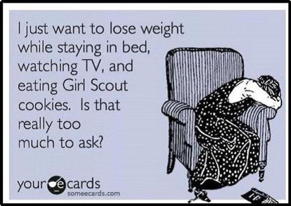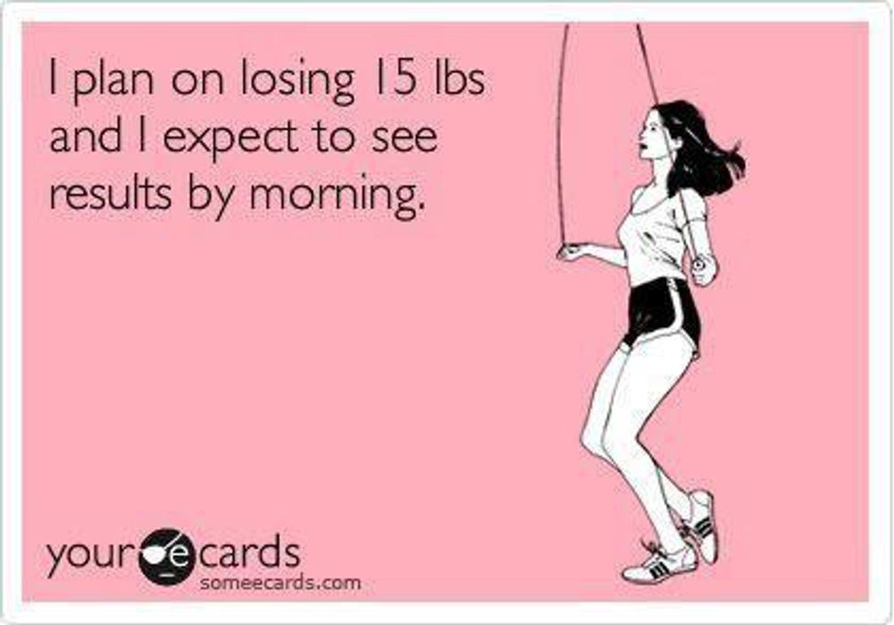 So a week ago, I found myself trudging to the gym after class. I made myself put on my yoga pants and a shirt, I made myself fill up my water bottle and I made myself get on the treadmill. Thirty minutes later, after struggling to keep my heart rate over sixty-five percent and also trying not to die, I was a sweaty mess. I still made myself get on the stair stepper and do another 15 minutes on there. By the time I went home I was so tired that I fell asleep on the couch after just sitting there for five minutes. It was terrible, I hated it and it obviously didn't work because I still wasn't skinny.
