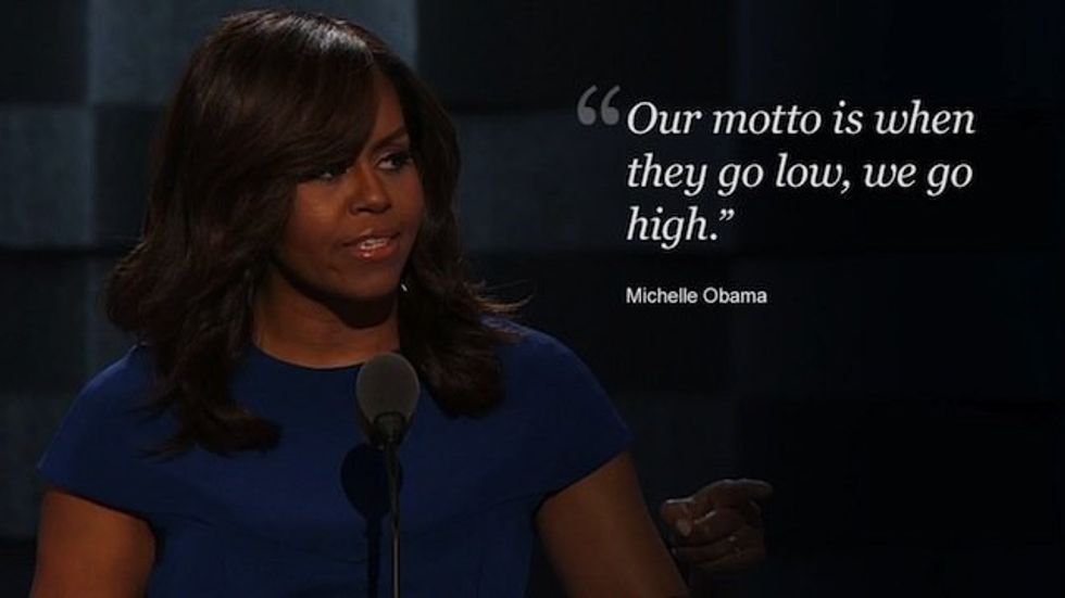 While explaining the influential role of the President on our children in her speech, the First Lady stated: "How we insist that the hateful language they hear from public figures on TV does not represent the true spirit of this country. How we explain that when someone is cruel or acts like a bully, you don't stoop to their level. No, our motto is, "when they go low, we go high." She never mentioned Donald Trump by name, but shamed his tendency to insult and mock others. We should not lower ourselves to the level of name-calling, and should instead work on rising above to put forth positive political and social change.