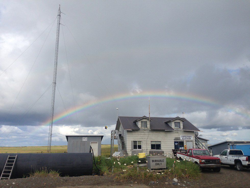 On either side of the Blue House I found the beauty of the earth. Out my door was a marsh of tundra. Here I would be awakened by the shrill excitement of my neighbors with the sight of a bear and her cubs or delighted by the purest of sunrises or bewildered by a perfect circle of a rainbow painted on clear blue skies after the grayest of storms.