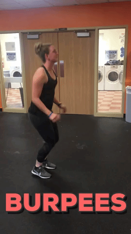 The most dreaded thing to hear. To start a burpee, stay standing. Then, jump up, bring your hands down to your feet and then jump your feet out and back in then stand back up.