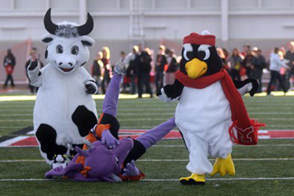 I think we need to start with this mascot’s choice of footwear. WHAT ARE THOSE? On a more serious note, a hen is a pretty odd choice for a mascot and not intimidating at all. Those shoes are pretty scary though.