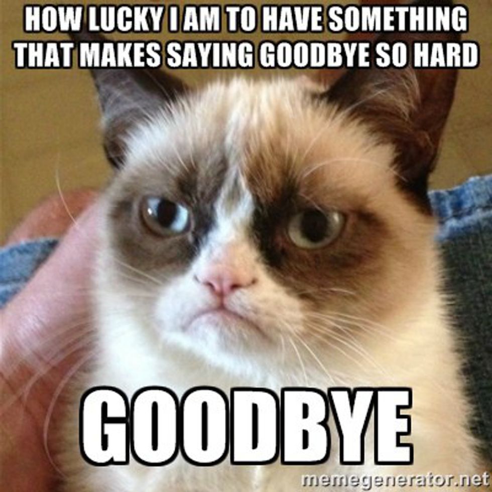 While it isn't easy to say leave good old hometown friends, it's a little bit different. You've just had so much fun together on whatever break or time you've been at home or in a new place and all of a sudden time just runs out. You end up being really excited for each other because it's cool to see where people who have been together for sometime end up branching out to. But all the while the high-octane fun with people you've gotten to know so well has to cease for awhile. And the part that makes this suck is when you come back home and remember how good it is to be around each other. It's a mix between being happy for new beginnings and really going to miss the good times.