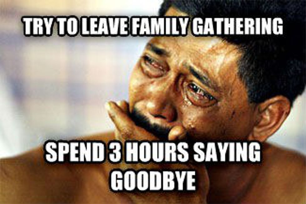 There is no over-arching way to describe how everyone says goodbye to parents, siblings, and relatives. All that can be said of it is that it is sad and the single most dreaded moment for both parties. You spend time together, support each other, bounce off personalities, and share in so, so much. It's the worst relationship to have long distance because some of the biggest parts of what makes families tight-knit are being with and around each other more than they're alone. Without a doubt family is the hardest goodbye and the ones you hang on to every single day after leaving home.
