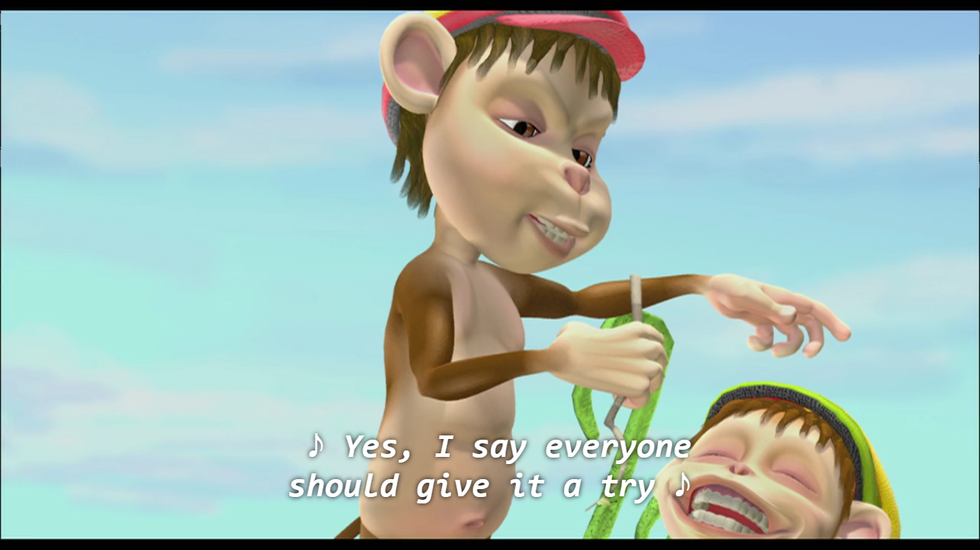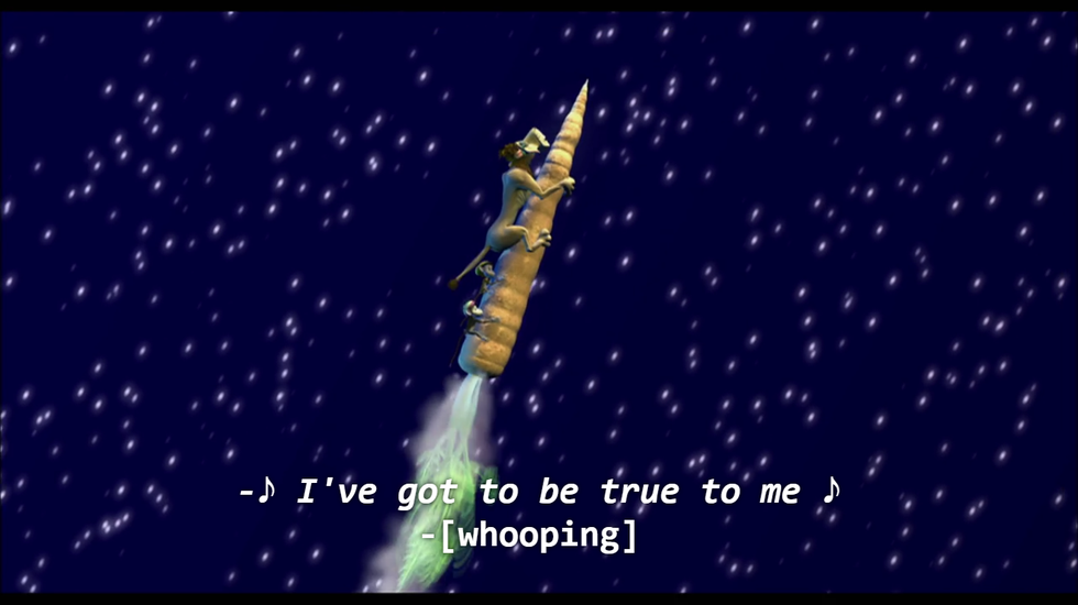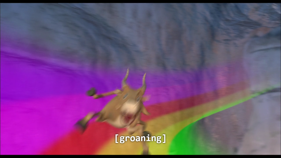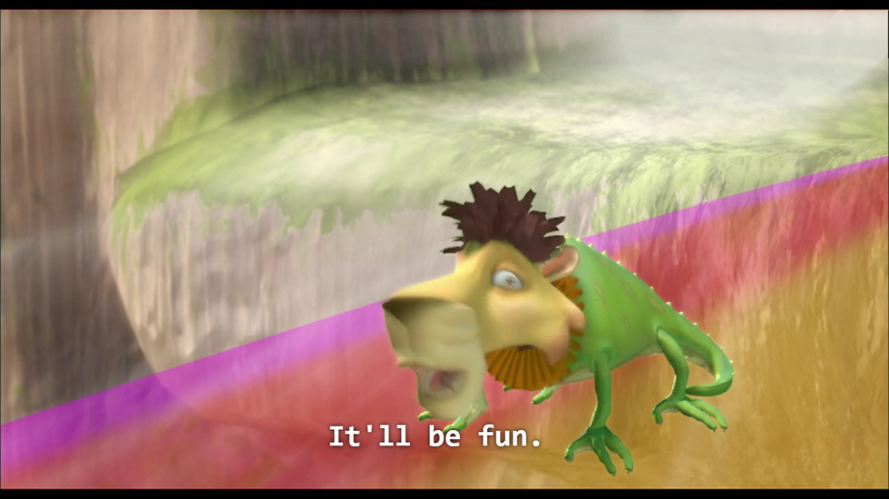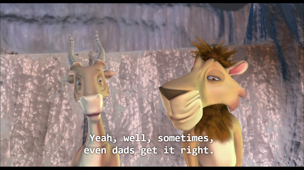 Leo gives us two compelling leads who adopt a cohort of orphaned children after a fire ravages the jungle. Their relationship is healthy, supportive, and definitely has homoerotic undertones. Leo and Lope (the denture-wearing antelope) share touching moments throughout the film, such as when Leo rescues Lope from another lion, the two watch their adopted children of a day (?) frolic in the Heart of the Jungle, and Lope temporarily dies, leaving Leo to have flashbacks of all their scenes together from the previous half hour of the film before falling asleep by Lope’s side. Also, there are magical rainbow milk slides.
