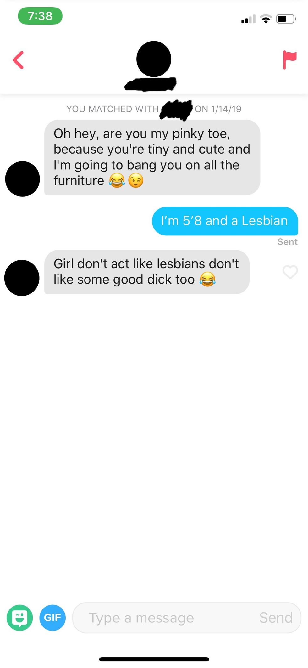 My girlfriend received this pickup line and didn't have to say much in return for this guy to show his true colors. Not only did he probably Google "best pickup lines" prior to shooting his shot, but he ALSO proceeded to undermine exactly what it means to identify as a lesbian. Imagine having such a huge ego that you believe women who are exclusively attracted to other women are just busting at the seams to have sex with you. My advice for this sucker? Quit chasing after people who will never be interested in you. Oh, and lose that sense of entitlement while you're at it.