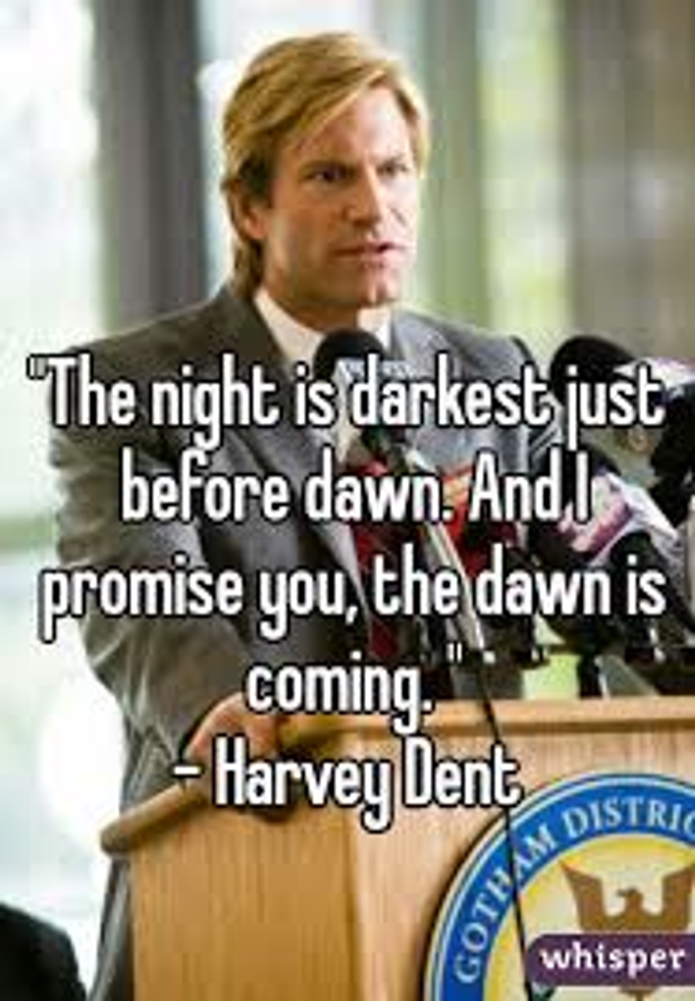 Words of the famous Harvey Dent promising Gotham City that good will come. Life may seem at its worst much of the time, but that only makes the good days even better.