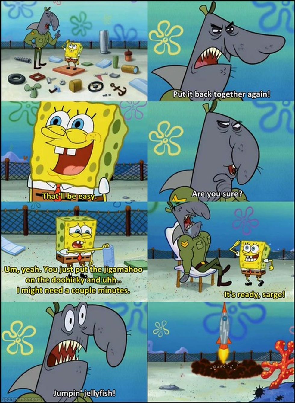BOI SpongeBob was a ball of energy the majority of the time. No matter if he was at school, work or facking around, he is giving all of his energy. I know that it is not possible to be like that all the time and SpongeBob knew that too, nevertheless he always tried to put his best foot forward and go through life with a smile on his face and pep in his step.