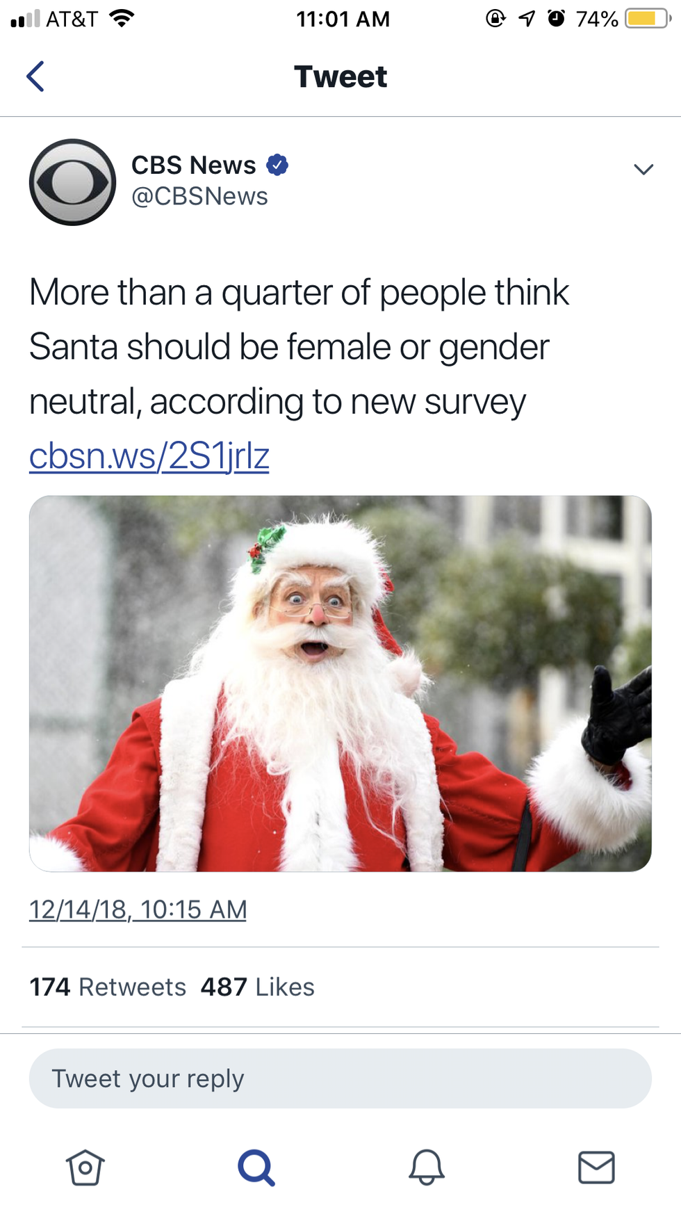 According to CBS News, they tweeted out that more than a quarter of people think Santa should be gender neutral, or female - but wait if he can't be male, why can he be female? Would that not offended someone?...