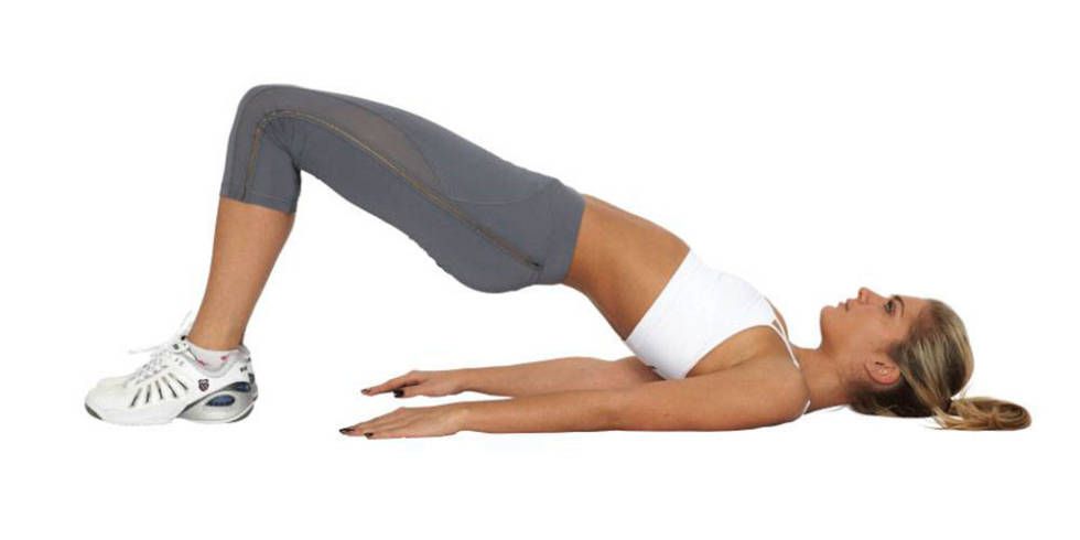 Bridge Opposite Arm-Leg Reach: Lie face up with your left knee bent, left foot flat on the floor, and right leg extended toward the ceiling. Reach toward the ceiling with your the left arm and keep your right arm down by your side. Without moving your hips or shoulders, open your raised leg to the right and raised arm to the left. Now, concentrating on your abs, return your raised leg and arm to the center. Do 10-12 reps, then switch sides and repeat.