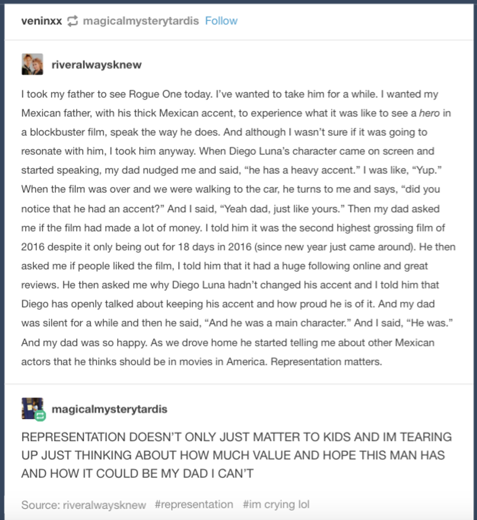 The other night I was scrolling through Tumblr, avoiding more important responsibilities such as writing my grad school essay and doing homework for my winter class, and I found a heartwarming post that needs to be shared. The post received over 20,000 shares on Tumblr, and a few days later, major media sources covered the story. I'd like to say I found it first, but the fact that it is actually getting attention in the first place is more important. This post illustrates just how important representation is in the media and how much of an impact it makes on minorities who aren't used to seeing people who look like them on the big screen. I touched upon the importance of Latino representation in a previous article, however, this issue is very important to me and I feel as though it needs to be reiterated because there is still a long way to go in this fight for representation.