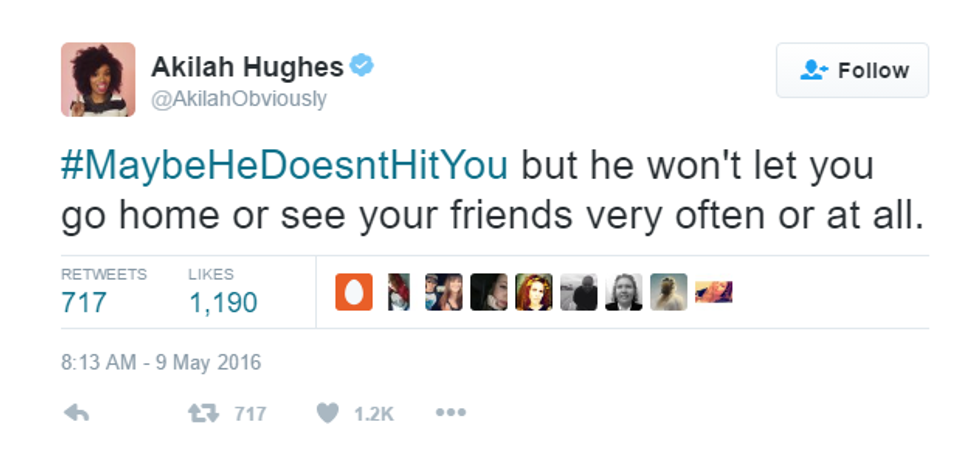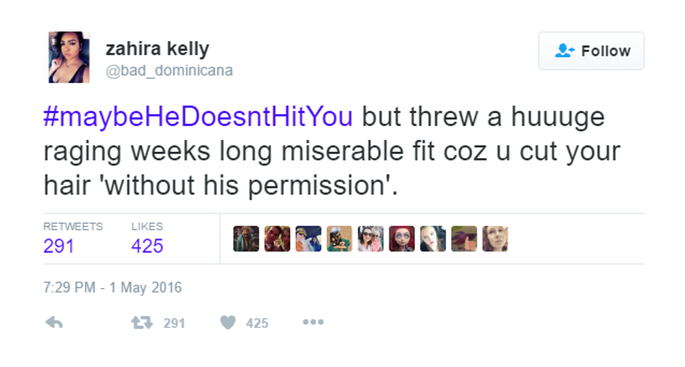 Writer and artist Zahira Kelly (@bad_dominicana on Twitter) started the Twitter trend #MaybeHeDoesn'tHitYou which highlights the importance of recognizing abuse culture.