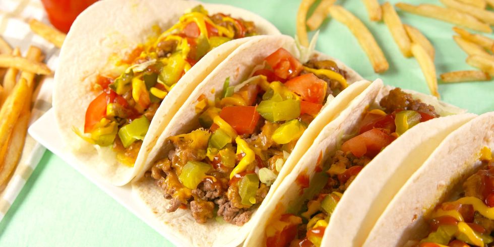 Cheeseburgers are about as American as you can get; why not stuff them in a nice soft tortilla shell as well! Honestly, there are not too many different ingredients from a normal taco... You still need your beef, some cheddar cheese, chopped tomatoes, chopped pickles, put it all on a nice and warm tortilla and garnish with some ketchup and mustard or whatever you desire.