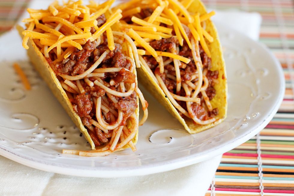 I saw these first on an episode of iCarly back in the day and I forced my mom to make them for me. They were surprisingly not that bad. I would recommend using a hard taco shell - it would be easier than just smushing everything all together and making a mess. Just make your spaghetti and meatballs as you would normally, stuff it all into a shell, and enjoy!