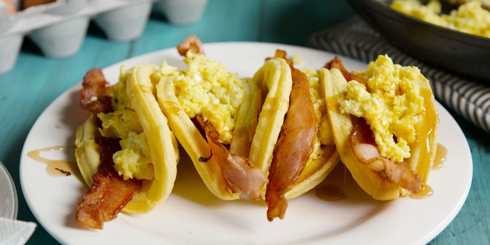 As you can see, there is basically a taco for every meal of the day. So, if you wanted, you could eat tacos all day long. For these, you can use frozen waffles or make your own. Make those waffles, cook up some bacon, scramble some eggs, even add some sausage if you want. Oh, and don't forget the cheese - whatever kind you want. Drizzle with some warm syrup... Good Morning!