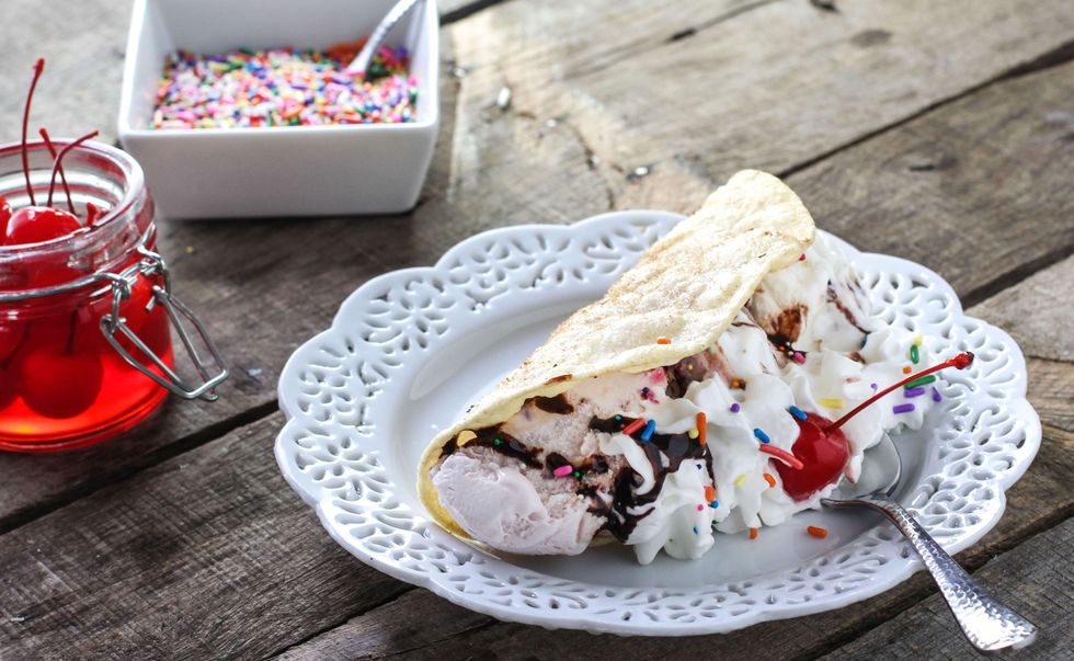 You will need some hot oil to basically deep fry your tortilla - no complaints from me about that. Then, whatever ice cream you want... All one kind or three different kinds. Lay your banana in the shell, top with three scoops of ice-cream, add some sprinkles, whipped cream, a cherry, chocolate... However much you want to load up on your taco sundae.