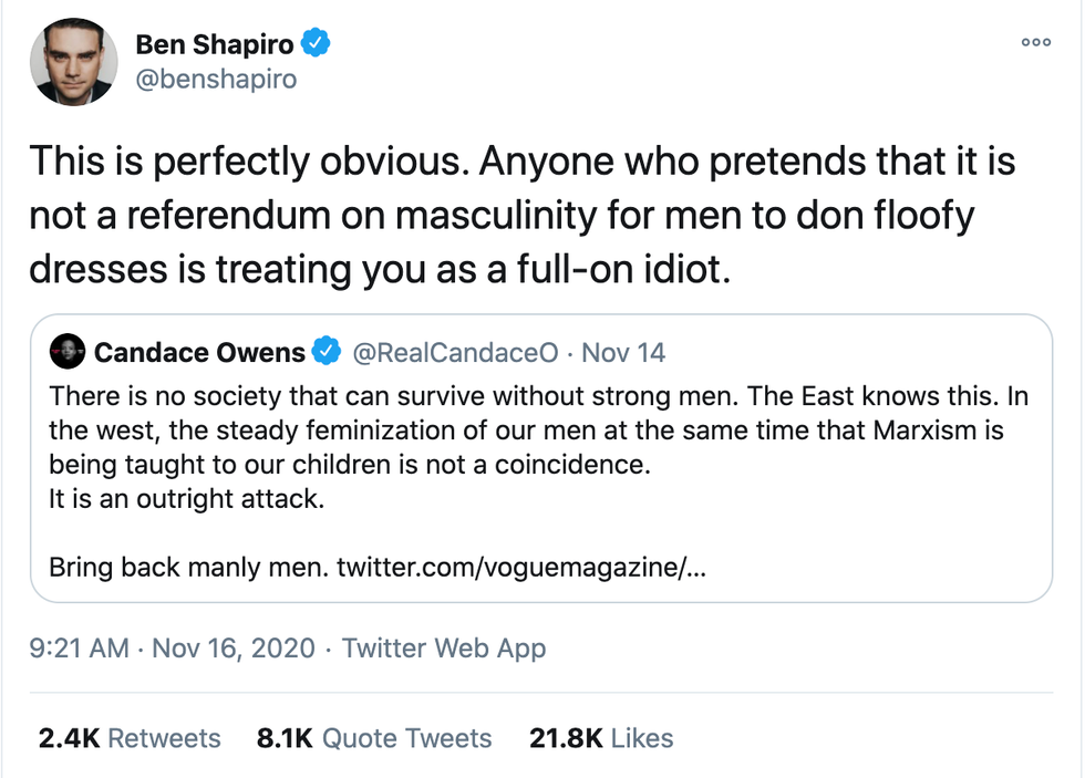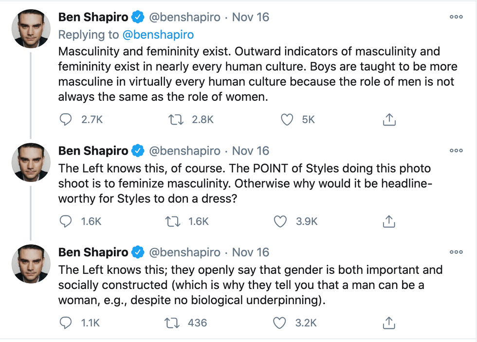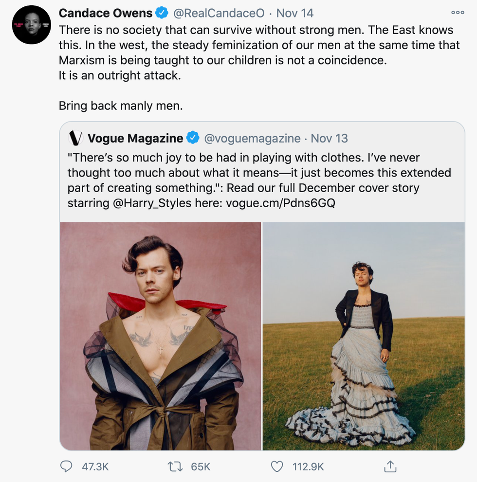 Their comments sparked conversation about Harry Styles's outfits during the Vogue shoot. He was photographed wearing dresses, skirts and other "traditionally feminine" clothing items. People like Candace Owens and Ben Shapiro, took offense to this creating long threads to attack Harry and other men who wear clothing like this.